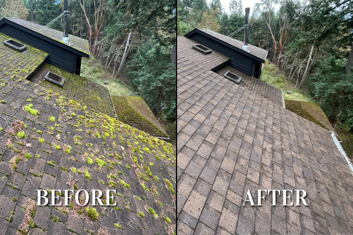 Our soft-wash system safely removes moss, algae, lichen and black streaks without damaging shingles. Biodegradable solutions kill growth at the root for long-lasting results on asphalt, cedar, metal and tile roofs across the Lower Mainland.